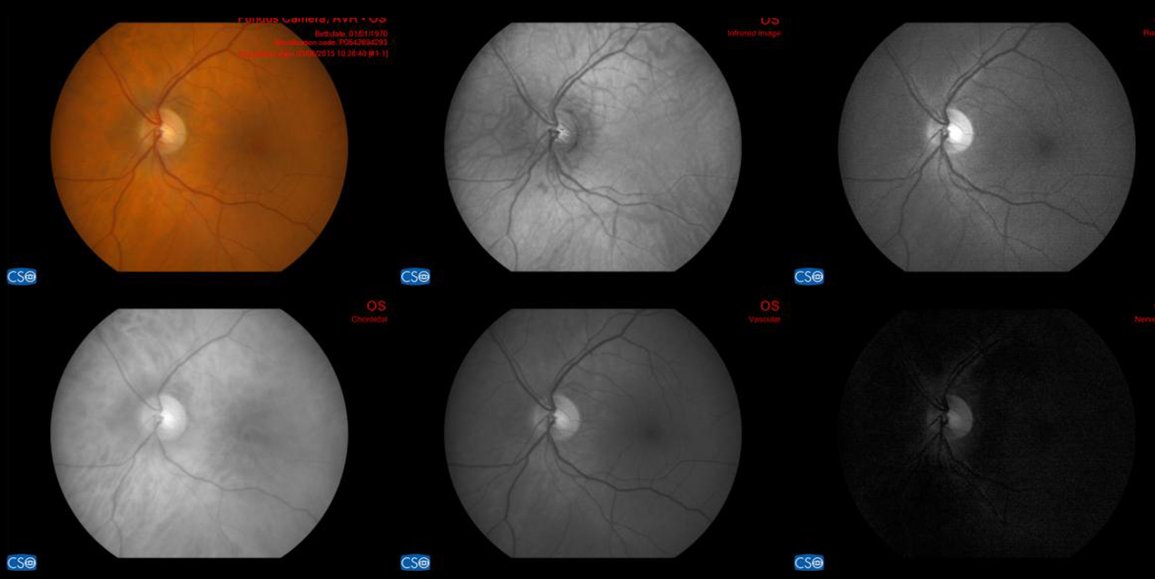 Original image, infrared image red-free image; as well the choroidal, vascular and nerve fiber images.